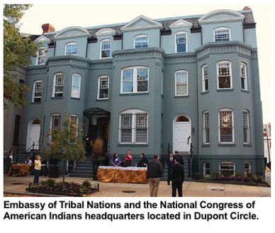 Two blocks away from Gloria's place is the headquarters of the National Congress of American Indians and the Embassy of Tribal Nations. Their complex is located in an embassy-sized townhouse representing Native Americans and Alaska Natives. Tenants include the National Indian Education Association and the Native American Rights Fund.